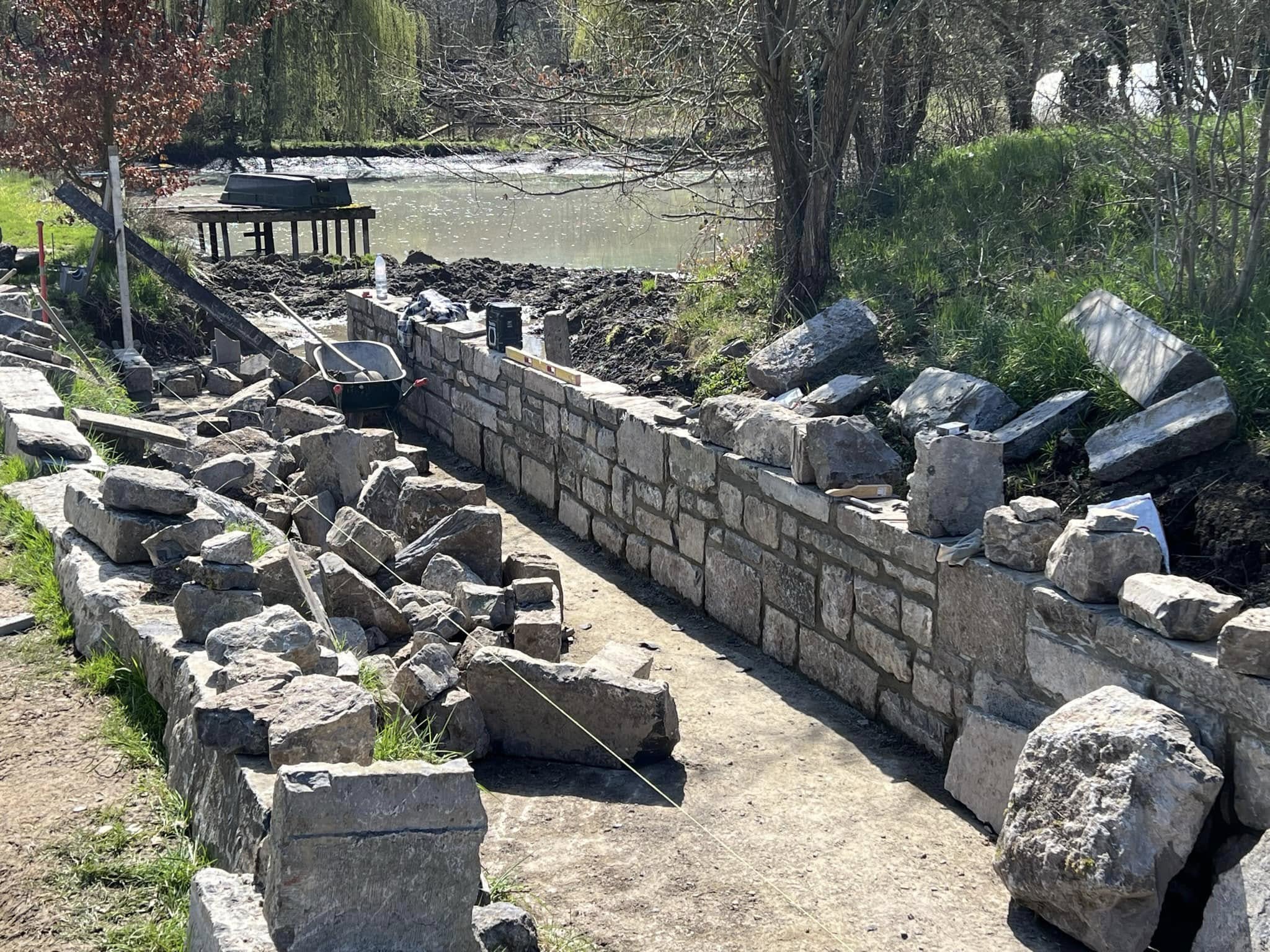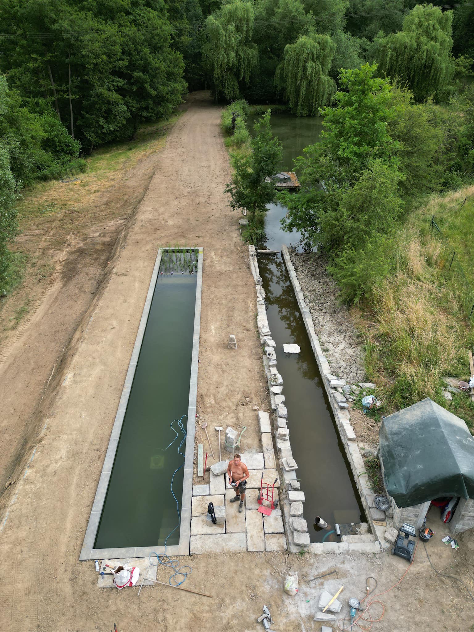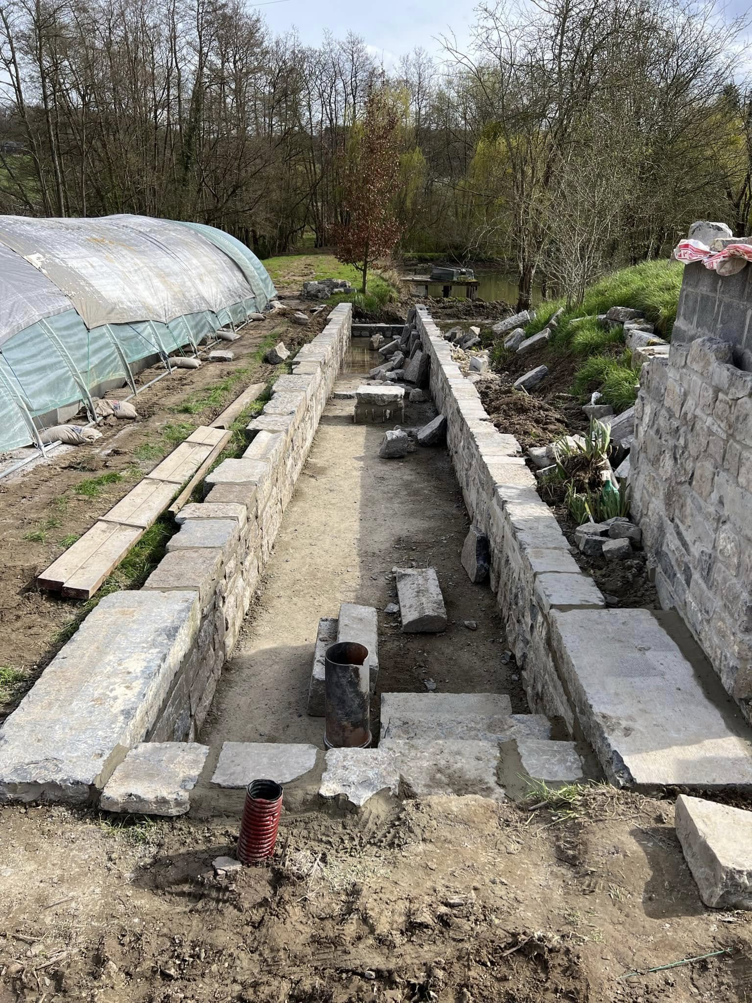 Installation du système de drainage périphérique. Sur les terrains namurois à nappe haute, pose d’un puits de décompression vertical avec repères de niveau d’eau — obligatoire pour la durabilité de la piscine.Évacuation des terres