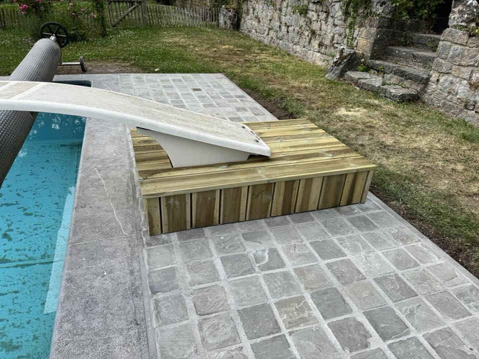 Terrassement partiel pour niveler et créer une plateforme stable. Décaissement de la zone, pose d’une sous-couche drainante et dalle béton de fondation selon le modèle choisi. Dalle béton inclusePiscine bois semi-enterrée
